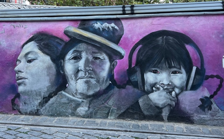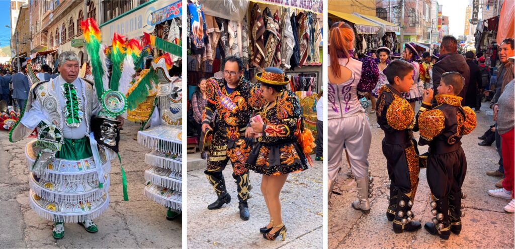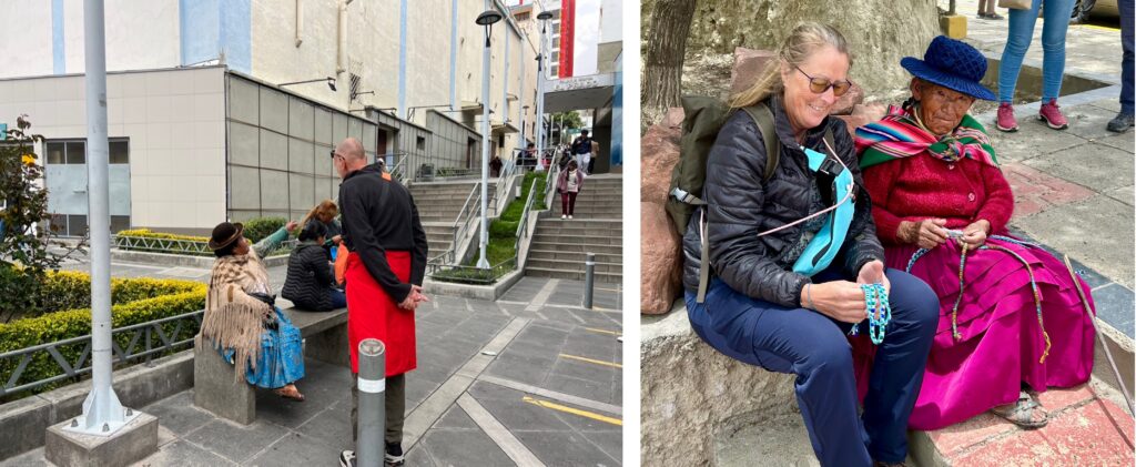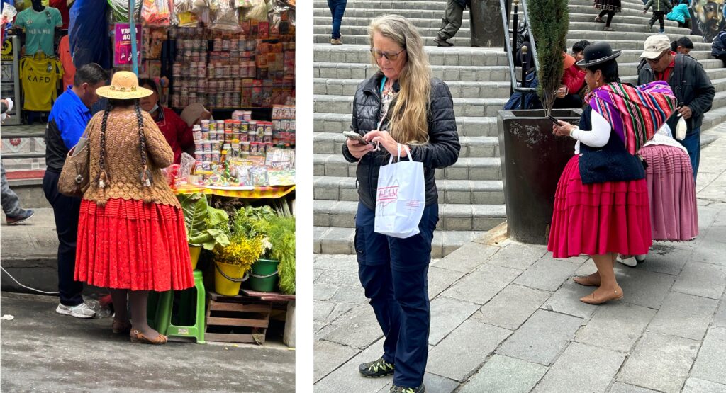 La Paz und vorallem El Alto hat einen sehr grossen Anteil an indigener Bevölkerung, die inmitten der Stadt immer noch ihre althergebrachte Kultur aufrechterhalten. Da mischen sich traditionell in weiten Röcken, Ponchos und Hüten gekleideten Indiofrauen mit jungen modern angezogenen Frauen mit Designerklamotten zu einem kunterbunten Mix. So ergibt sich ein buntes und stark kontrastierendes Stadtbild, was uns immer wieder aufs Neue begeistert. Was aber alle benutzen ist das Handy. Modern times halt…
