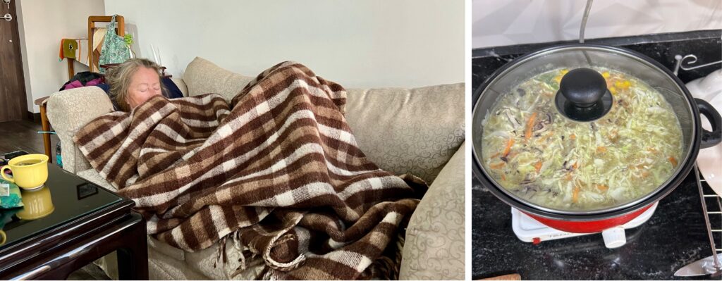 Dort – also im Bett – bleibt Biggi für die folgende 48 Stunden auch liegen! Teilweise mache ich mir echt Sorgen, denn sie ist fast schon komatös. Einmal habe ich ihre Hand genommen – sie war eiskalt und hing ganz schlapp runter – bis sie endlich reagiert hat, bin ich vor Angst fast erstarrt! Ich schaffe es am ersten Tag nur mit Mühe und Not, sie dazu zu bringen, wenigstens ihre Medikamente und etwas Koka-Tee zu trinken.