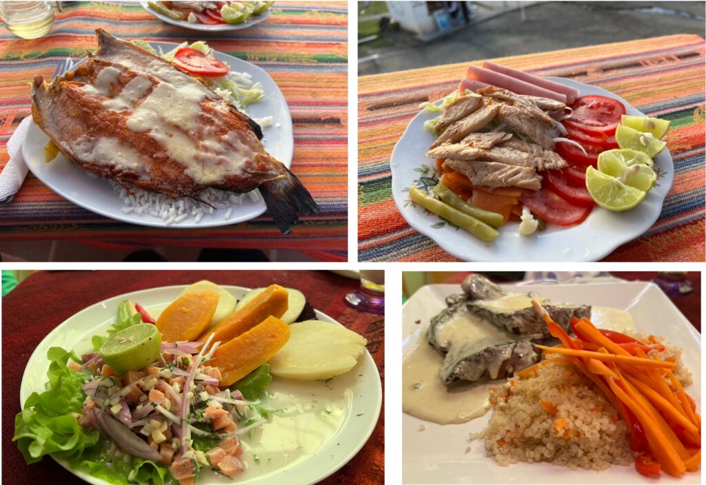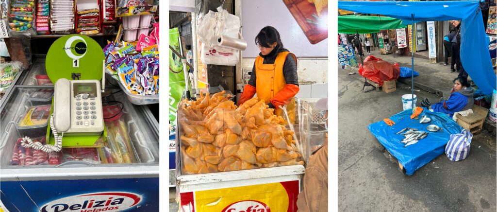Dann gibt es natürlich ganz viele Stände mit allerlei Früchte und Gemüse, die für uns teilweise völlig unbekannt sind, wie z. B. Kartoffeln, die wie weisse Kieselsteine aussehen. Vereinzelt werden Fische aus dem Titicaca See am Strassenrand auf Tüchern am Boden feilgeboten. Kühlung? Fehlanzeige!