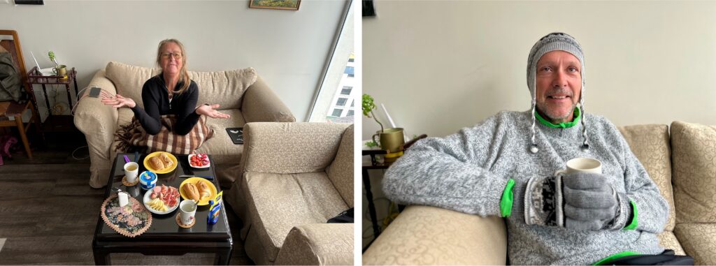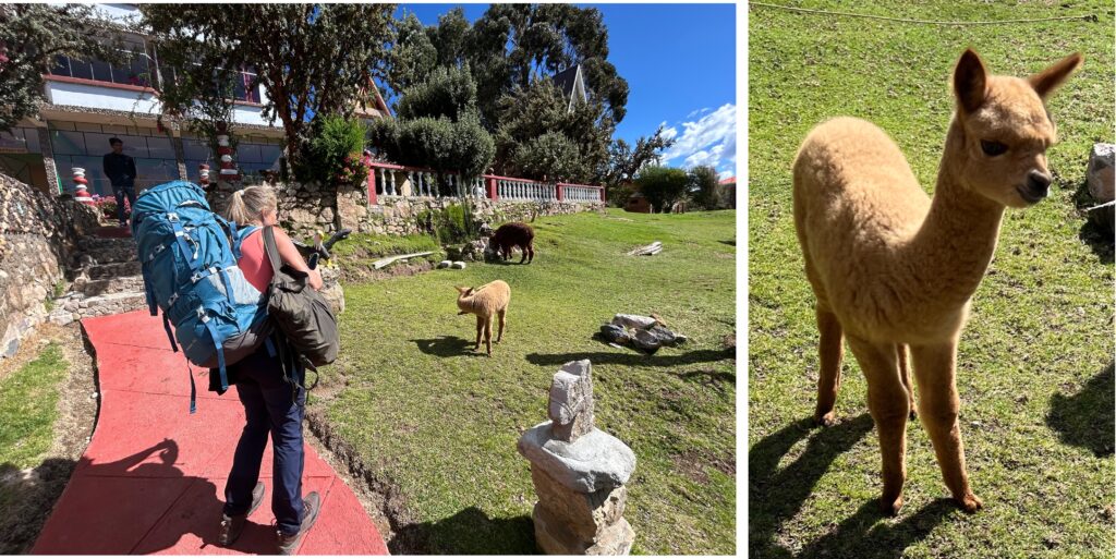 Neben der Aussicht gibt es noch einen schönen Garten mit ein paar Liegestühle in der Sonne, wo man die Aussicht über den See geniessen kann, während Hühner und ein Lama mit Kalb herumlaufen. Dorthin flüchten wir auch nach dem Frühstück, welches wir in unsere Daunenjacken im etwa 5 Grad „warmen“ Essraum essen durften. Wir sind wahrlich nicht Leute, die luxuriöse Unterkünfte brauchen, aber das hier war auch für uns zu heftig.