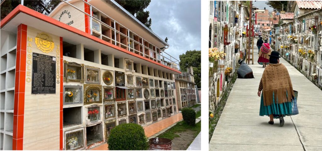 Ein Besuch am Stadtfriedhof von la Paz zeigt auch, dass der Umgang mit den Toten ganz anders als bei uns und auch vom Aberglauben geprägt ist. Die Gräber sind vier „Stockwerke“ hoch übereinander angeordnet. Der Friedhof wirkt ein bisschen wie ein Quartier von Mehrfamilienhäusern. Jedes Grab hat ein kleines „Schaufenster“ wo Bilder vom Toten sowie allerlei Grabbeigaben zu sehen sind. Die Grabbeigaben sind oft Lieblingsgegenstände vom Verstorbenen oder Getränke und Nahrung- und Genusssmittel. Das ergibt für uns komisch anmutende Gräber, wenn in den Fenstern teilweise Coca-Cola oder Schnapsflächschen oder Zigaretten liegen.