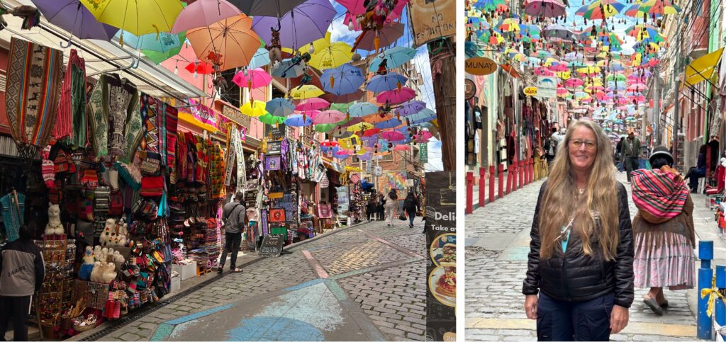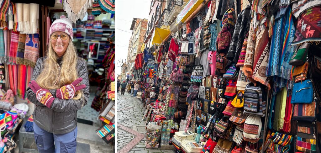 Dass die Indiokultur tatsächlich aktiv gelebt bzw. praktiziert wird, entdeckt man als Tourist vor allem im „Mercado de las Brujas“ = „Hexenmarkt“. Dieser Markt erstreckt sich über ein paar enge Gassen in der Nähe der Basilica de San Fransisco in La Paz. Die meisten Läden im Markt sind heutzutage natürlich auf Touristen ausgelegt und bieten neben viel Krimskrams auch viele Produkte aus Alpakawolle an. Dort erstehen wir verweichlichte Tropensegler einige dringend benötigte warme Kleider. Neben Mützen, Handschuhe, Schals und Socken gibt es warme und schön gestrickte Pullis für die ganze Crew. Alles schön farbenfroh und aus lokaler Herstellung.