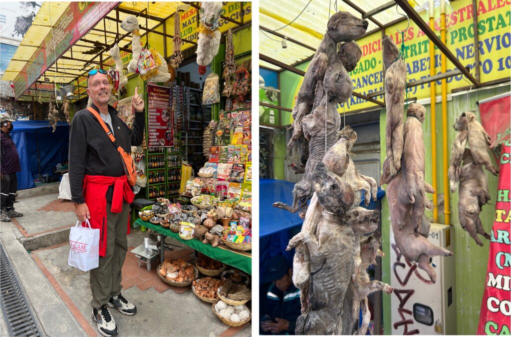 Etwas weiter hinten im Markt kommen dann ein paar Läden, wo das Sortiment etwas anders ist: Statt farbenfrohe Alpakawollprodukte hängen dort Lamaföten(!) und zum Teil sogar Schweineföten an den Läden. Zuerst denken wir noch, dass es Stofftiere seien, aber bei näherer Betrachtung realisieren wir, dass dies echte mumifizierte Tiere bzw. Föten sind! In den Läden drin findet man haufenweise Pillen, Pülverchen und Tinkturen gegen allerlei Gebrechen und Sorgen. Auch die Ladeninhaberinnen und Kunden sind eher Einheimische als Touristen.