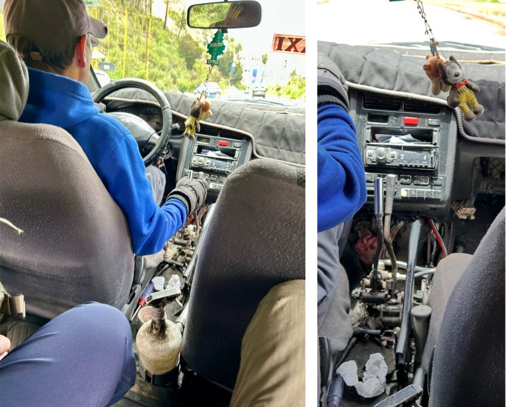 Ein Tag fahren wir mit dem Taxi ins „Valle de la Luna“. Nur schon die Taxifahrt war ein besonderes Erlebnis. Das Auto war in einem derart desolaten Zustand, dass es ein Schweizer Strassenverkehrsbeamte zur Schnappatmung gebracht hätte. Aber der Clou war die offene Schaltkulisse!