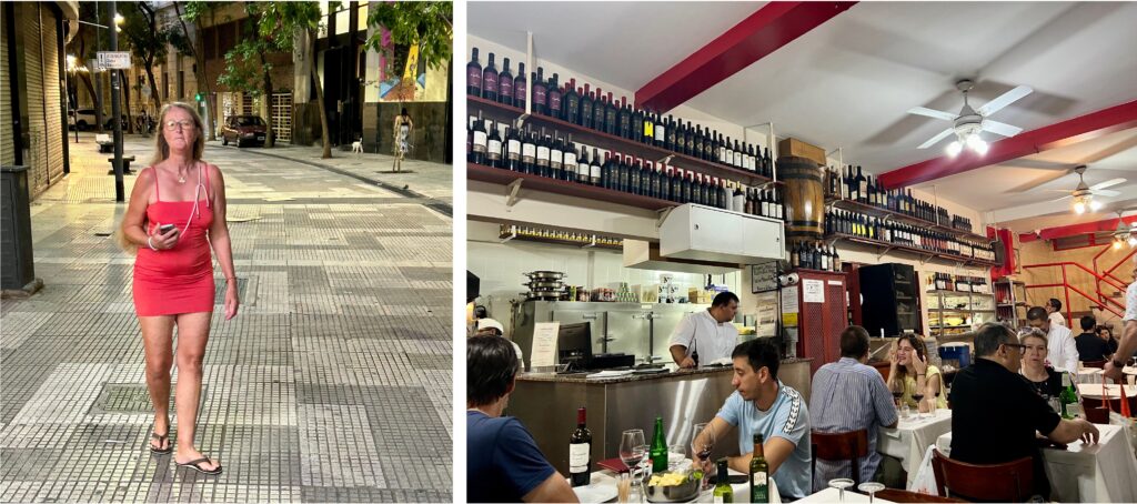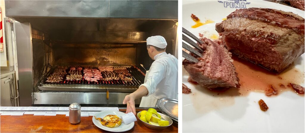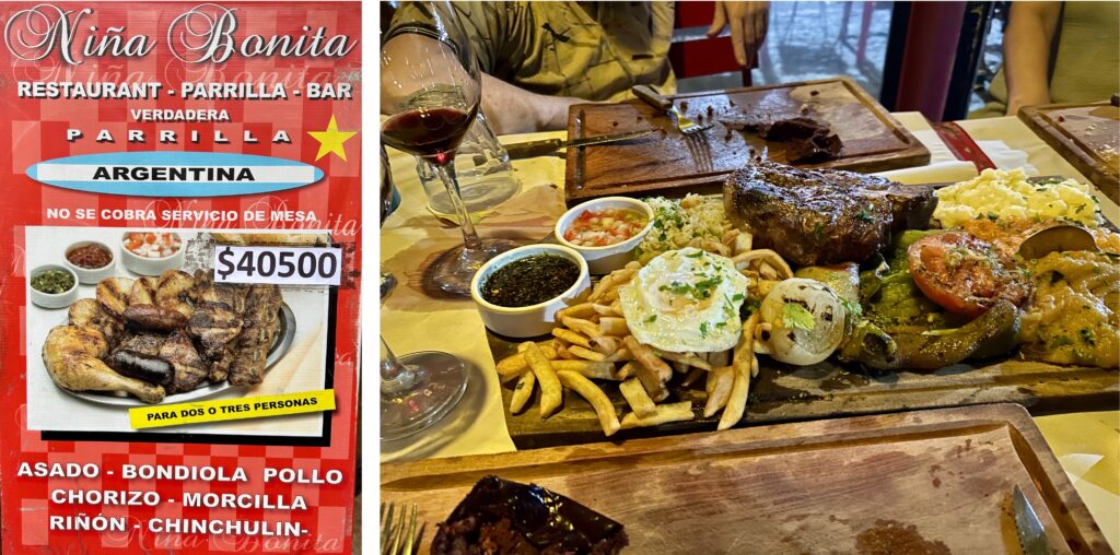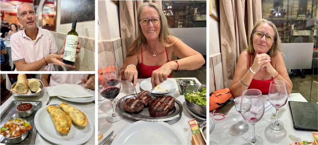 Da wir beim ersten Aufenthalt drei Tage Zeit für die Stadt haben, wollen wir sie auch gut nutzen. Daher gehen wir schon am ersten Abend in ein typisches Argentinisches Steakhouse essen. Auf die Argentinischen Steaks haben wir uns schon lange gefreut und nach der mehrstündigen Stadtwanderung sollte auch der nötige Appetit kein Problem sein. Voller Vorfreude bestellen wir zwei grosse Entrecots und eine gute Flasche Argentinischen Rotwein. Als „cubierto“ stellt der Kellner ungefragt zwei Empanadas, Brot und die typischen Beilagen hin. Ausgehungert wie wir sind überlegen wir nicht gross, sondern geniessen die wirklich leckeren (und gar nicht kleinen) Empanadas. Dann kommt das Essen – zwei riesige Stücke perfekt gegrilltes Fleisch, jedes sicher 400 gr schwer, dazu eine grosse Schüssel Salat und eine ebenfalls grosse Portion Kartoffelstock – für zwei Personen!