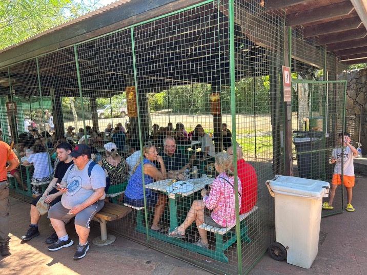 Wegen den vielen frechen Nasenbären müssen die Menschen ihren Imbiss in einem Käfig geniessen – umgekehrte Welt 🙂