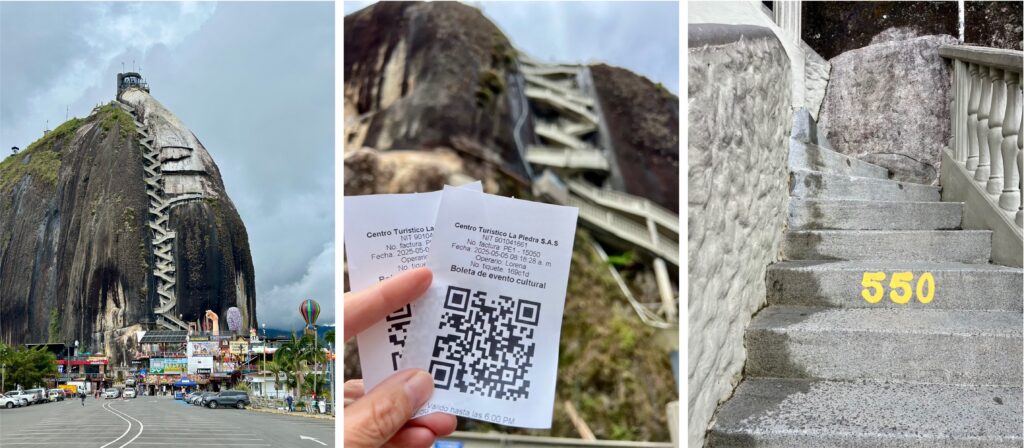 Eine geführte Tour ins farbenfrohe Städtchen Guatapé ist noch auf unserem Programm. Wir buchen einen Tagesausflug einschliesslich Frühstück, Mittagessen und Bootsfahrt. Die Busreise führt durchs grüne hügelige Hochland Kolumbiens – das kommt mir irgendwie bekannt vor, denn es hat eine gewisse Ähnlichkeit mit dem Zugerland. In dieser Region wird alles Mögliche angebaut und eigentlich sind hier alle auf Grund der geologischen Verhältnisse Bergbauern. Über 2000 m gelegen und alles steil. Wir wollen auf den Berg, ein Monolith, den Fels von Guatapé (spanisch El Peñón de Guatapé). Wir stehen davor und Biggi darf gar nicht gross darüber nachdenken, erstens wegen der vielen Stufen und zweitens wegen ihrer Höhenangst.