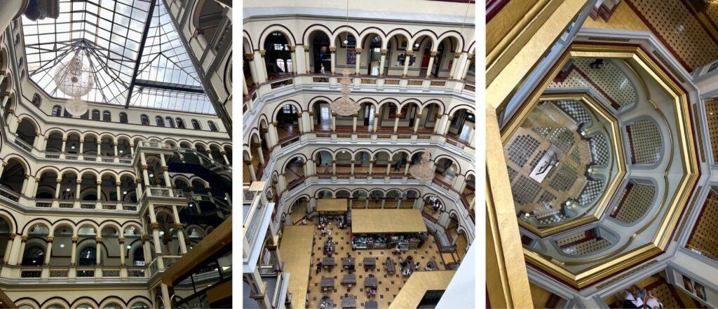 Mitten in der City in der Nähe der Metrostation San Antonio befindet sich in einem historischen Gebäude die Galeria de Arte Palacio Nacional. Auf den ersten beiden Stockwerken sind lauter kleine Läden, in denen „Original-Designerware“ verkauft wird. Schuhe, T-shirts, Hemden, Sportbekleidung für wenig Geld. Und wie hat uns Dio erzählt, alles im Gebäude gegenüber in der Schneiderei hergestellt. In den oberen Etagen finden wir Skulturen und Bilder verschiedenster Künstler, man könnte stundenlang durchschlendern. In der Rooftopbar gönnen wir uns einen feinen Jugo natural – frischen Saft.