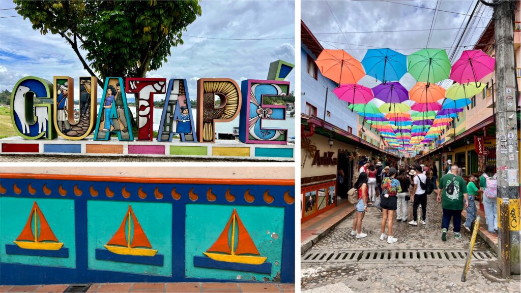 Der Ausflug ins Städtchen Guatapé ist was ganz Besonderes. Nach einem feinen Kaffee sind wir bereit für die Stadtrundfahrt mit einem der Motochivas (chivas sind übersetzt Ziegen). Unser Fahrer versucht es erst mit englisch, aber nachdem er merkt, dass wir bisschen spanisch sprechen, verfällt er komplett in seinem Kauderwelsch. Nicht alles was aus ihm rauskommt verstehen wir, aber die Erklärung für die dreidimensionalen Wandmalereien, die an den bunten Häusern angebracht sind schon. Da darf scheins jeder machen, wie er gerne möchte. Entweder ist es ein Hinweis auf den Beruf, was beim Bäcker, Metzger oder in der Näherei ganz eindeutig ist. Oder das Hobby ist abgebildet, wie mit den Radfahrern, oder einfach, was einem gefällt, Blumen, Vögel, Ornamente. Der Fantasie sind keine Grenzen gesetzt.