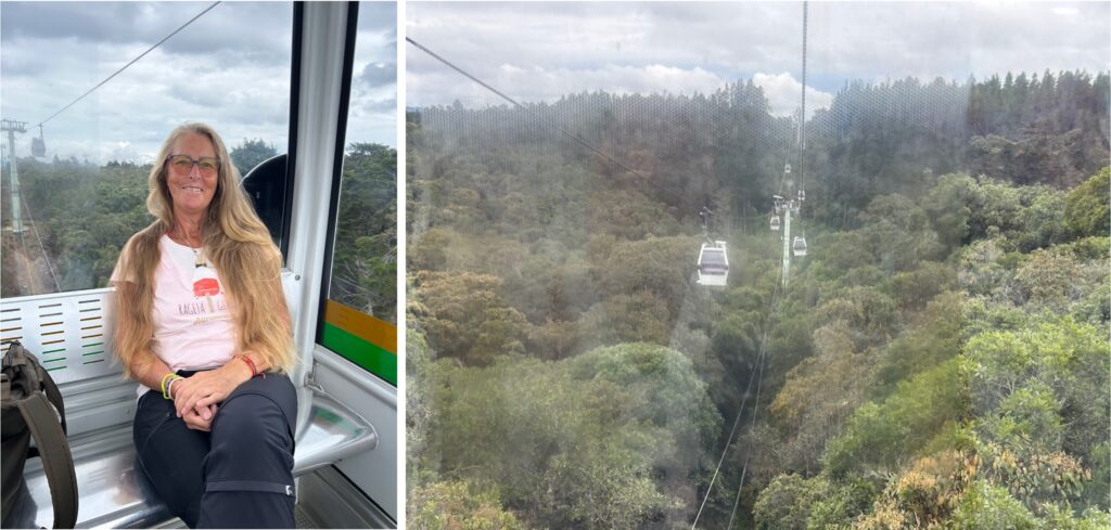 Der Nationalpark Arvi ist unser heutiges Ziel, weil es heisst, dass es hier unter anderem tolle Wandermöglichkeiten gibt. Der Park ist etwa 16’000 Hektar gross und hat im Jahr ca. 100‘000 Besucher. Von Picknickservice über geführte Wanderungen, Radtouren, Ausflüge auf Pferden, Zip-Lining, Camping, ein Markt für Souvenirs und Essen bis hin zu kulturellen Veranstaltungen, da ist für jeden was dabei. Wir kratzen heute mit unserem Besuch nur bisschen an der Oberfläche. Los geht’s. Zuerst mit dem Bus: La Palma bis Industriales (1522 müM), dann Metro A: Industriales – Acevedo, umsteigen auf Seilbahn K: Acevedo – Santo Domingo und schliesslich die Seilbahn L: Santo Domingo – Arvi (2527 müM). Auf der Fahrt mit der ersten Seilbahn wird deutlich, dass – je höher die Menschen in den Steilhängen wohnen, desto ärmlicher die Wohnverhältnisse sind. Man sieht mehr Wellblechdächer und die Häuser sind enger aneinander gebaut. Für die letzte Seilbahn müssen wir für hin und zurück knapp 100’000 COL (20 €) berappen. Was uns anfangs teuer erscheint, erweist sich durchaus als berechtigt, denn die Fahrt geht so 20 Minuten über die Baumkronen hinweg mit einem phänomenalen Ausblick auf die Stadt und das Hochland.