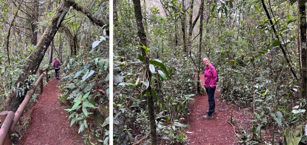 Der Eintritt in den Park sind nochmal 60‘000 COL (12 €). Wir bekommen ein orangefarbenes Band ans Handgelenk und nach einer kurzen Einweisung werden wir zum Eingang des Wanderwegs begleitet. Da wir nur einen halben Tag eingeplant haben, ist unsere Auswahl an Aktivitäten nicht so riesig. Das passt mit den paar Möglichkeiten laut Plan gut zusammen. Auf uns warten 3 ausgeschilderte Wege, die alles in allem etwa 4 km lang sein sollen. Das sollte gut ohne Guide zu bewerkstelligen sein. Wir – als die Meister unter den Pfadfindern – schaffen es tatsächlich mal wieder uns zu verlaufen. Egal, drehen wir halt eine Ehrenrunde. Die Höhe, die kalte und feuchte Luft im Nebelwald und das ständige rauf und runter zehrt an den Kräften. Wir sind gar nicht so unglücklich über die kurze Distanz. Es ist unglaublich grün und unterwegs sehen wir ganz viele verschiedene Orchideen (die kleinste so gross wie ein Fingerglied), Bromelien, Farne, Flamingoblumen, Pilze etc. etc.