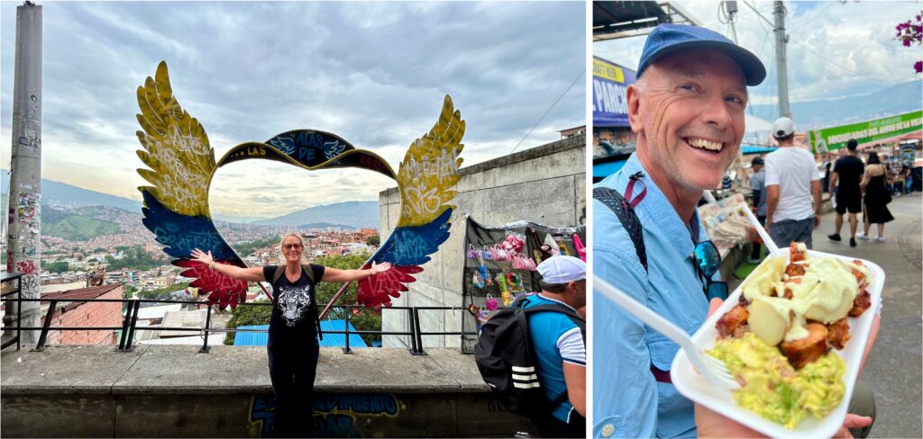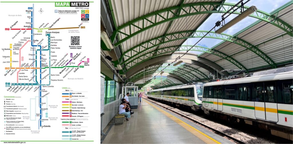 Also eines müssen wir echt sagen, wir waren noch nie mit einem so sauberen ÖV unterwegs wie hier. Ganz egal, ob an den Haltestellen, im Metrobus, in der Metrobahn oder in einer der Seilbahnen. Du findest nirgends auch nur ein Krümelchen auf dem Boden, kein altes Taschentuch oder Bonbonpapier, keine beschädigten Sitze und keine Schmierereien – nix – nada! Die Einwohner Medellins, die sogenannten Paisas sind sehr stolz auf die innovative Entwicklung ihrer Stadt, die in den schwersten Stunden begonnen hat. Und dementsprechend werden diese Errungenschaften gehegt und gepflegt. Hier wird eindeutig gelebt, was im Bus auf der Leuchtreklame propagiert wird: La Cultura Metro. Da stehen dann so Sätze wie „wir nehmen Rücksicht aufeinander“, „wir respektieren einander“, „wir verzehren hier nichts“, „wir hinterlassen alles sauber“, „wir grüssen und lächeln, weil das alles einfacher macht“ und hinter jedem Satz steht ein Lach-Smiley 🙂 Und es funktioniert tatsächlich! Es ist eine wahre Freude. Auf einer Fahrt mit Bus und Metro wird Biggi gleich dreimal ein Sitzplatz angeboten – Muchas Gracias, aber das ist ihr dann fast schon wieder zu viel.