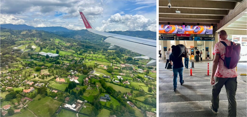 Nach einem etwas holprigen Landeanflug kommen wir sicher und pünktlich am Flughafen von Medellin José María Córdova an. Ein Taxi ist auch gleich gefunden und der junge Taxista schnappt sich direkt mal die schwarze Tasche von mir. Biggi trottet mit ihrem inzwischen auf 16 kg angeschwollenen Rucksack auf dem Buckel hinter uns beiden her und ich „Gentleman“ denke mir nichts dabei… Zum Glück sind es nur 50 m, aber trotzdem blöd von mir.