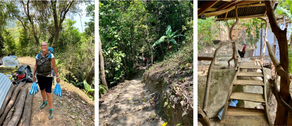 Um 8:15 Uhr laufen wir los mit dem Ziel, eine kleine Kaffeefarm zu besuchen, ein Familienbetrieb. Der Weg führt erst durchs Dorf, dann am Fussballplatz vorbei und weiter auf einer unbefestigten Strasse, runter zum Fluss und der Rest ist nur noch bergauf. Dafür ist die Aussicht der Hammer.