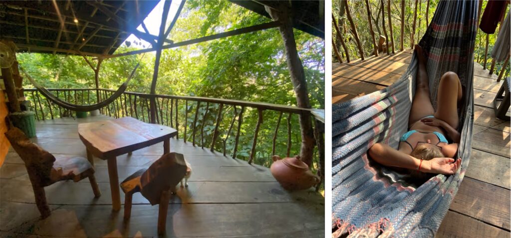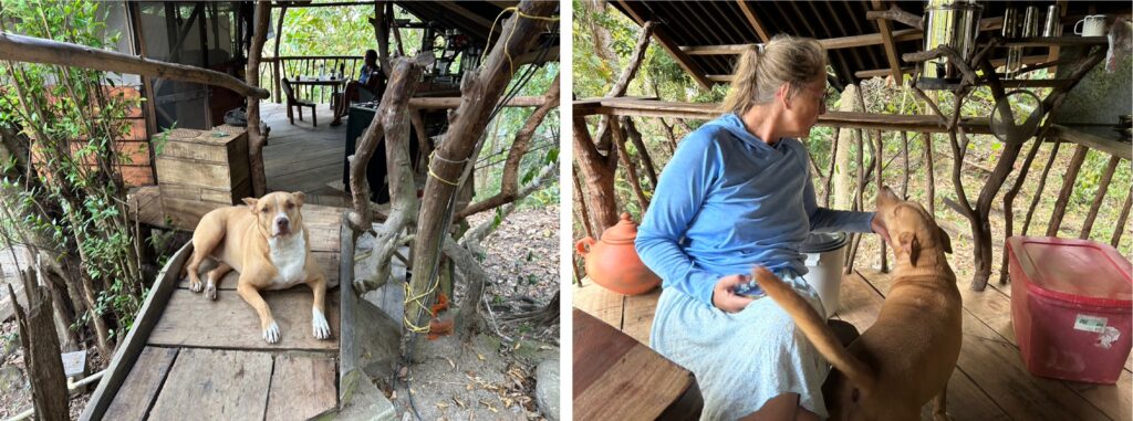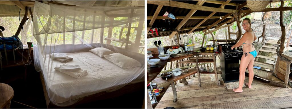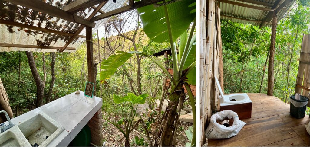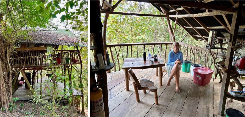 Willkommen im Baumhaus! Alles, also wirklich alles, ist sehr offen gestaltet. WC und Bad sind an 2 Seiten ungesichert und wir müssen uns erst daran gewöhnen, dass wir bei unseren „Aktivitäten“ freie Sicht auf den Abhang haben. Das Schlafzimmer ist mit einer Tür ausgestattet, die wir selbstverständlich immer geschlossen halten. Durch den Spalt kommen zum Glück nur kleine Tiere… Die Aussenküche ist genau Biggis Ding! Unser Vorratsschrank ist ein grosser roter Plastikbehälter. Das Regenwasser können wir filtern und so unser Trinkwasser selbst herstellen. Sogar Abfalltrennung wird praktiziert, dafür gibt’s die grüne und weisse Tonne. Und den Biomüll bekommen die Hühner. So nah an der Natur haben wir natürlich auch diverse Tiere vorm und im Baumhaus.