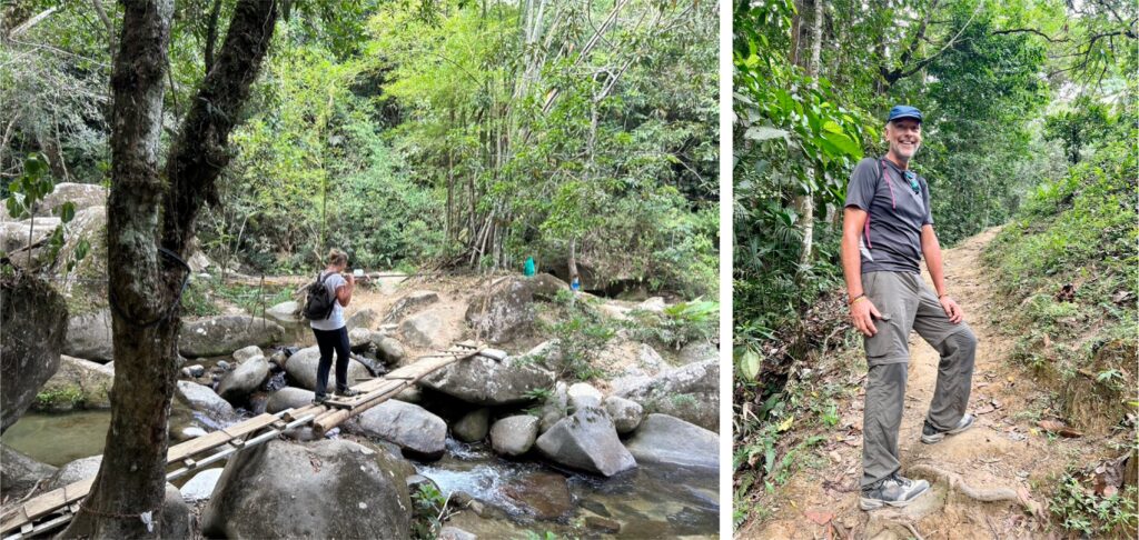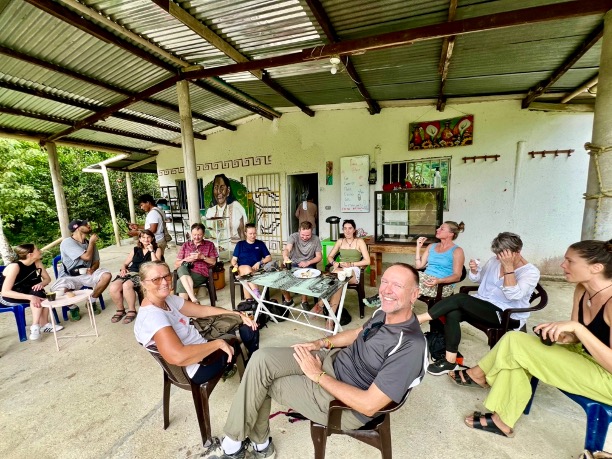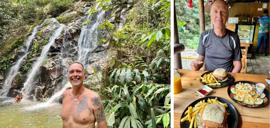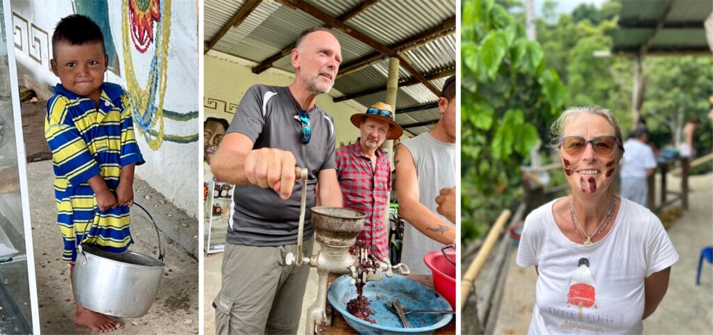 Für die Tour sind wir zu früh, also gönnen wir uns erstmal einen frischgebrühten Kaffee und leckere Zimtschnecken. Nach und nach kommen noch weitere Gäste und es stellt sich raus: alles Deutsche! Die Führung mit Früchtedegustation ist trotzdem auf englisch. Im Familienbetrieb arbeiten drei Generationen mit. Wir erfahren, was gut ist für die Kakao- und Kaffeepflanzen, wie und wann geerntet und verarbeitet wird, probieren geröstete Kaffeebohnen und mahlen Kakao zu einer Creme, die man entweder essen oder sich ins Gesicht schmieren kann als Kakaomaske. Im Anschluss erklärt Carlos, wo die vier indigenen Völker Kolumbiens ansässig sind und mit welchen verschiedenen Materialien jeweils Taschen und Hüte herstellt werden. Mit Kaffee und Honig im Gepäck treten wir den Rückweg an, überqueren wieder den Fluss und kommen am Wasserfall vorbei. Die vier Adonisse oben am Beckenrand denken wohl, Biggi macht das Video wegen ihnen und grüssen freundlich in die Kamera… Ein richtig toller Tag war das.