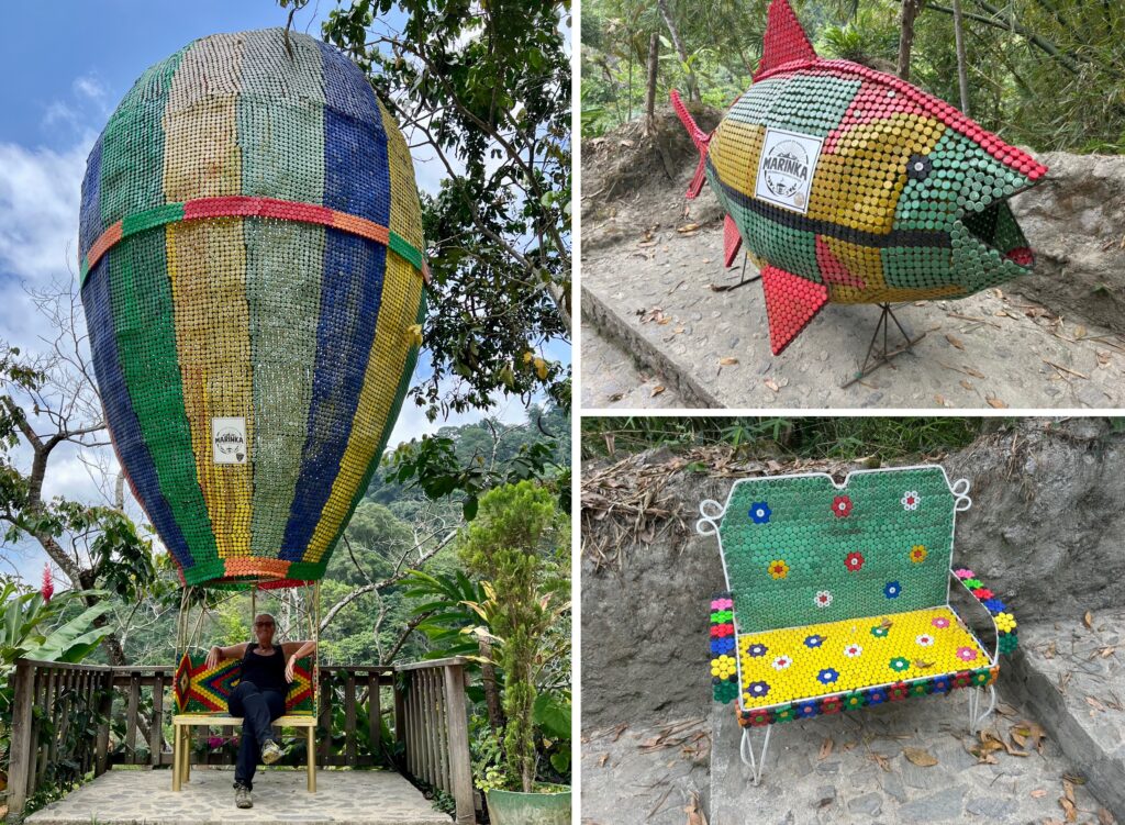 Aber so können wir uns nach der Anstrengung zumindest mit einem Bad im kühlen Nass und einem Burger hinterher belohnen. Aus Deckeln von Plastikflaschen haben findige Menschen Kunst durch Upcycling erschaffen in Form einer Flaschensammelstelle, Blumenampeln oder Sitzgelegenheiten. Schön bunt und eine coole Sache.