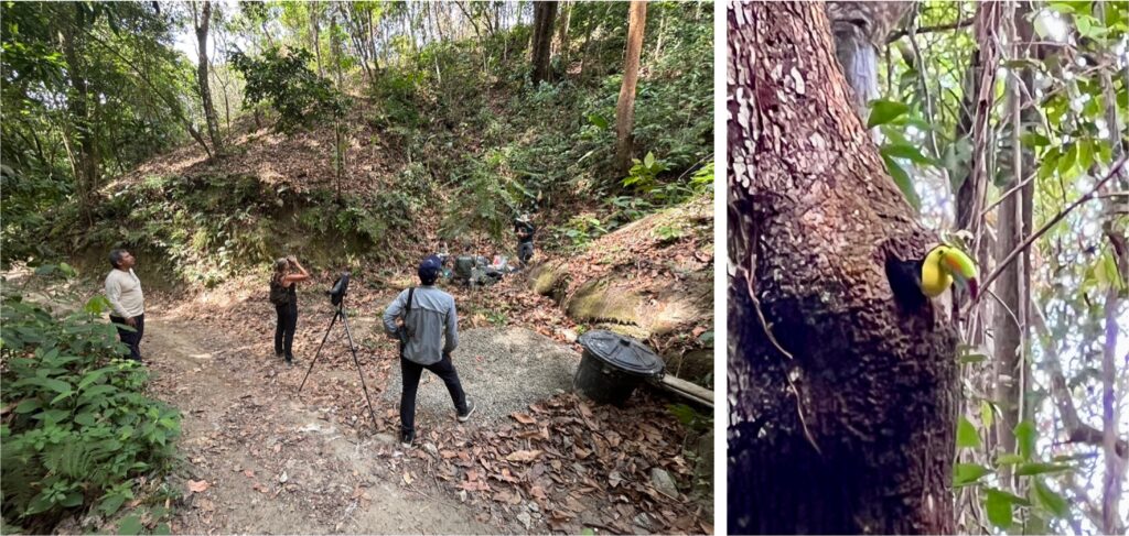Die Zeit im Baumhaus verging wie im Flug, ratzfatz sind 2 Wochen rum und es heisst Abschied nehmen. Wir beschliessen, die 20 Minuten bis zur Bushaltestelle zu laufen. Auf dem Weg ins Dorf kommen wir ein letztes Mal am Baum vorbei, in dem der Tukan wohnt. Wir sind vor ein paar Tagen mit einem Forscherteam von der Universität Bogota ins Gespräch gekommen, die in der Nähe des Baumes campiert haben und die haben uns den Vogel gezeigt. Und seitdem wir das wissen, gucken wir natürlich, ob er zuhause ist. Und tatsächlich, erst schaut der lange Schnabel aus dem Baumloch, dann kommt der Tukan raus und fliegt davon.