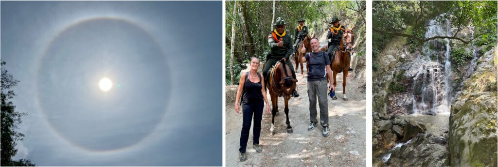 Die Sonne trägt heute einen Ring und wir machen uns auf zum Marinka Wasserfall. Unterwegs treffen wir schnieke Caballeros auf edlen Rössern, die gerne ein Foto mit uns machen wollen. Noch ein kurzer Smalltalk, dann geht’s schon weiter, für uns natürlich mal wieder nur bergauf. Biggi hätte wohl jetzt auch gern ein Pferd unterm Hintern.