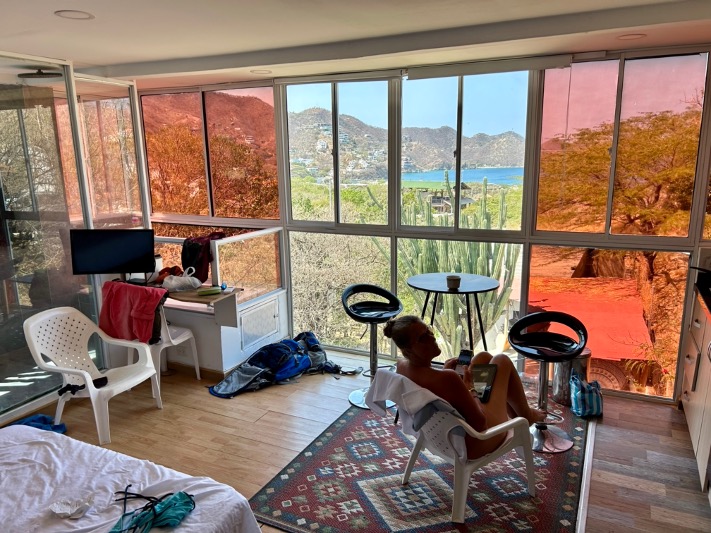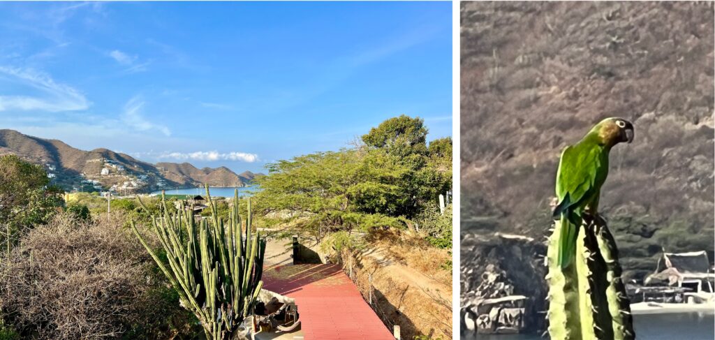 Also entscheiden wir den grössten Teil der verbleibenden Reisezeit in der Gegend von Santa Marta bzw. in Taganga zu verbringen. Unser Airbnb erfüllt einiges, was im Inserat steht: Meeresblick, Blick auf die Berge, warmes + kaltes Wasser (nach Tageszeit). Beim bequemen Bett können wir nicht zustimmen und der angepriesene Whirlpool erweist sich als 1,20 m Eigenbaubadewanne und lädt nicht gerade zum Verweilen ein. Wir stellen fest, dass das, was hier als Luxusunterkunft verkauft wird noch lange nicht europäischen Erwartungen entsprechen muss. Aber wir lernen jedes Mal dazu. Die vollverglaste Fassade gibt den Blick frei auf den Atlantik, die Berge und Nachbars Garten. Und da steht ein riesiger Kaktus, der bereits morgens um 6 einigen Vögeln als Nahrungsquelle dient. Spechte, kleine Papageien und andere bunte Vögel laben sich schön nacheinander am stacheligen Gewächs. Und ein Leguan wohnt auch hier.