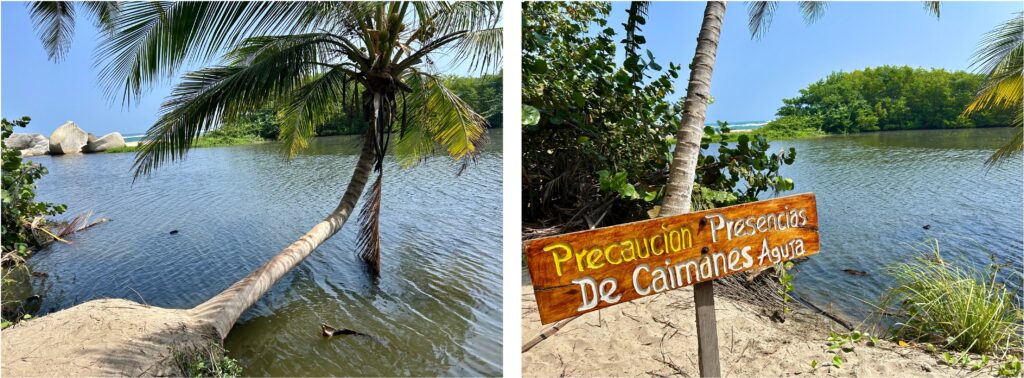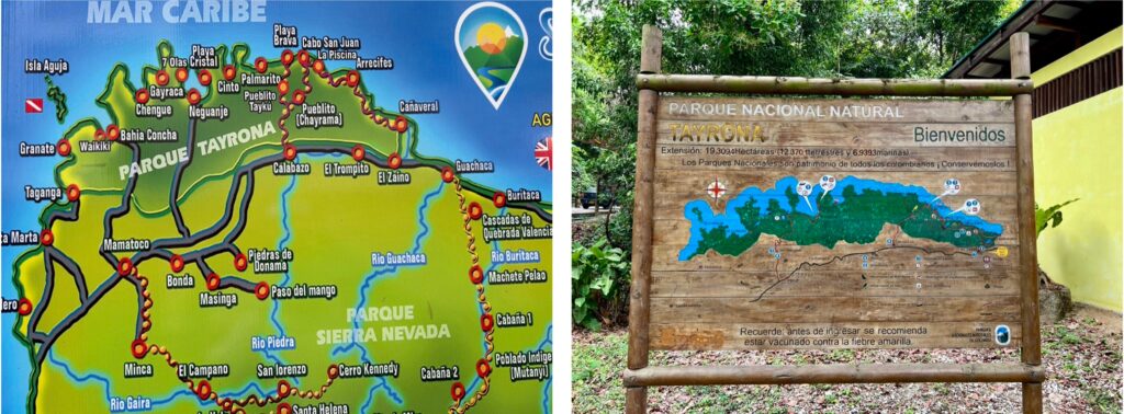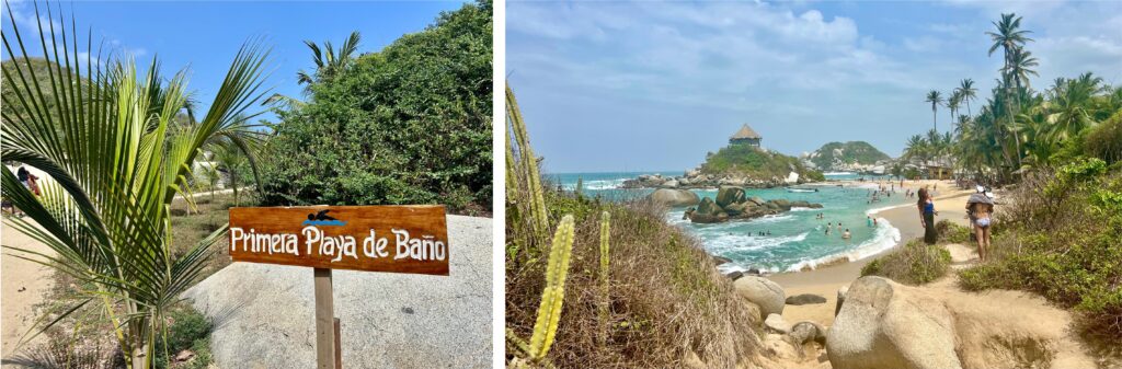 Der Tayrona Nationalpark ist der nördlichste Punkt unserer Südamerikareise. Er liegt nordöstlich von Santa Marta und ist für die kommenden drei Tage unser Wanderrevier. Wir lassen uns mit dem Taxi bis zum Eingang chauffieren und müssen feststellen, dass wir mal wieder nicht die einzigen sind, die da rein wollen. Die Schlange am Eingang ist lang und mit unseren Rucksäcken auf dem Buckel ist das Warten in der Wärme etwas anstrengend. Zum Glück geht es dann doch schneller als gedacht und wir machen uns zu Fuss auf zu unserer Unterkunft. Sind ja nur 20 Minuten zu laufen … ächz Mototaxis und Minibusse gäbe es schon, aber die lassen wir konsequent links liegen. Manchmal – aber nur manchmal – denke ich, wir sparen am falschen Ort.