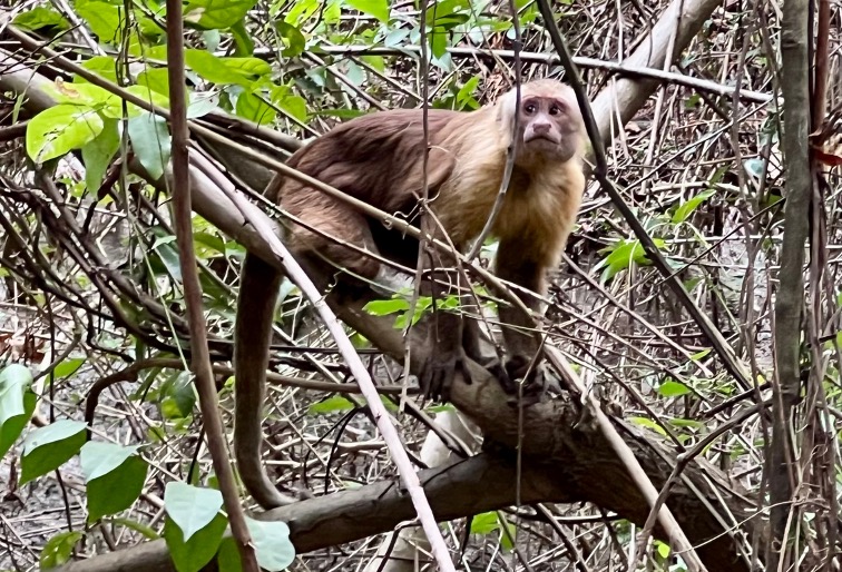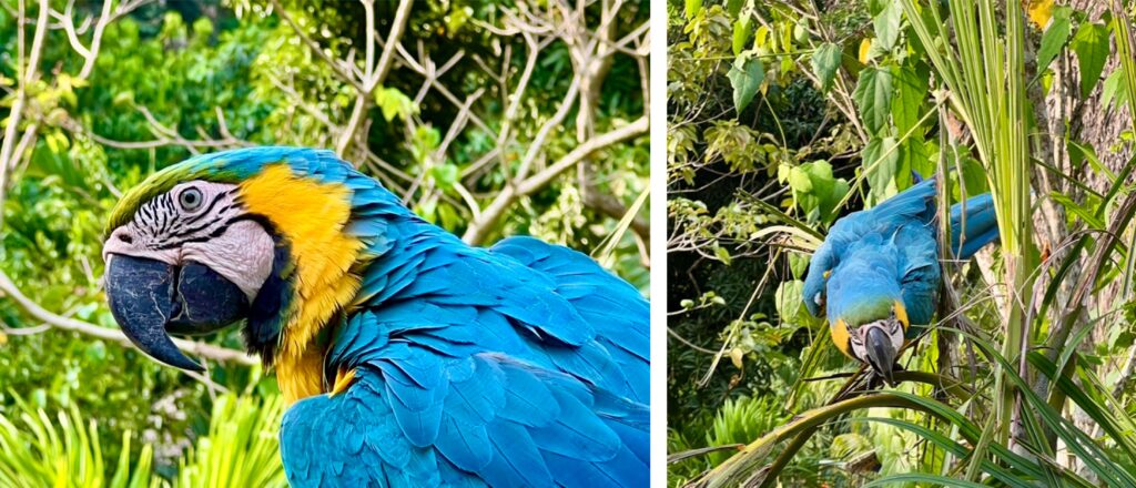 Flora und Fauna im Nationalpark begeistern uns immer wieder aufs Neue. Pflanzen so riesig, dass ich mit meinen fast 2m Körpergrösse wie ein Zwerg ausschaue. Ein schwarzer Kaiman lauert im Brackwasser hinter dem Strand. Braune Kapuziner und kleine Kapuzineräffchen kreuzen mehrmals unsere Wege. Und während sie in den Bäumen sitzen, lassen sie uns keine Sekunde aus den Augen. Wenn die Kapuzineräffchen miteinander rumtollen, scheint es ihnen egal zu sein, dass wir sie beobachten. Blattschneideameisen findet Biggi ja auch immer spannend. Da müht sich rund ein Dutzend Tiere ab mit einem 3 cm grossen Blattteil, sie ziehen und zerren in alle möglichen Richtungen, während die anderen ringsrum im Laufschritt vorbeiflitzen. Last but not least die beiden Ara‘s, die im Garten unserer Unterkunft zuhause sind.