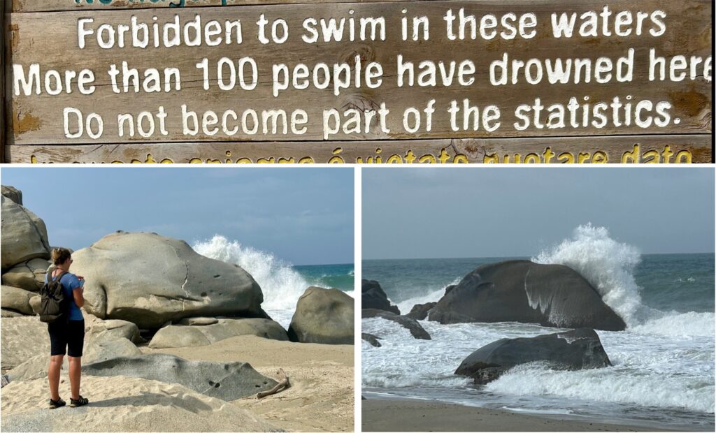 Auf den Anhöhen wird immer wieder ein fantastischer Blick freigegeben aufs Wasser oder den bergigen Dschungel. Die Luft ist diesig. Die meisten Strände sind aufgrund der starken Meeresströmung und grossen Wellen nicht zum Baden freigegeben und mit einer roten Flagge gekennzeichnet. Gemäss den Warnschildern seien bereits 100 Menschen ums Leben gekommen und man solle nicht ein Teil dieser Statistik sein. Guter Plan! Ein Strand ist sogar mit einer schwarzen Flagge bestückt, denn der ist für Schildkröten reserviert, die hierher zur Eiablage kommen.